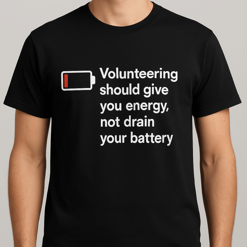 Hmm. “Volunteering should give you energy, not drain your battery” — that is a brilliant quote to print on a T-shirt or a large coffee mug!