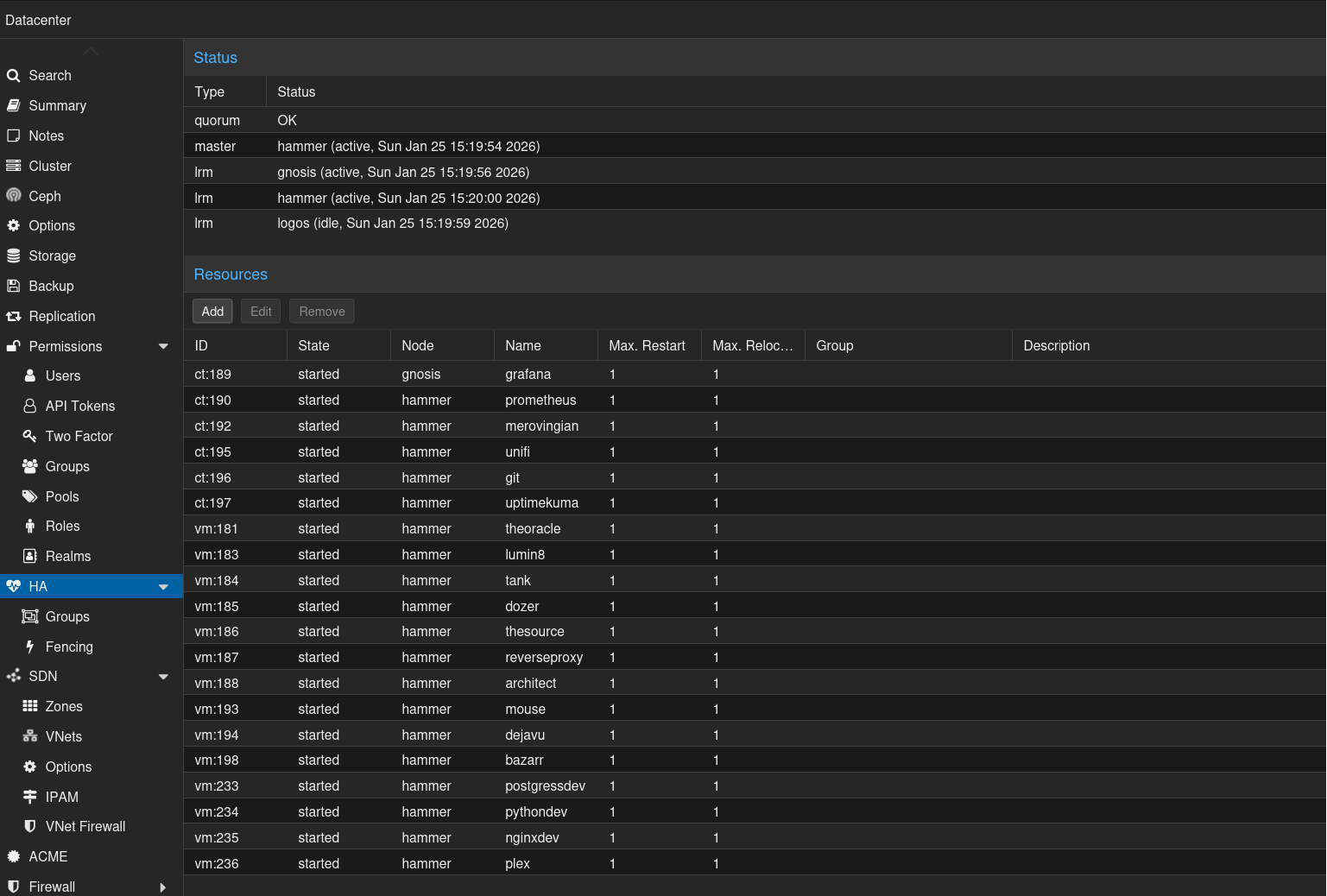 I only noticed when the web interface on hammer.home.lan came up completely empty, as if Proxmox had just been installed.