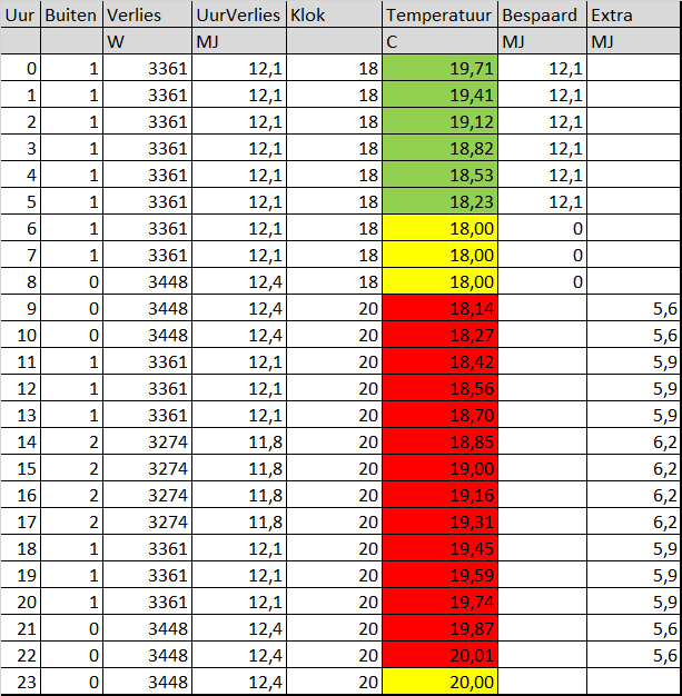 Ik ga hier uit van een gemiddelde winterdag zoals nu. Overdag een graad of 2 in de nacht rond het vriespunt. In de kolom staat het warmteverlies gedurende dat uur, afhankelijk van de buitentemperatuur.
