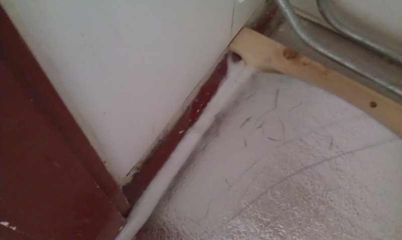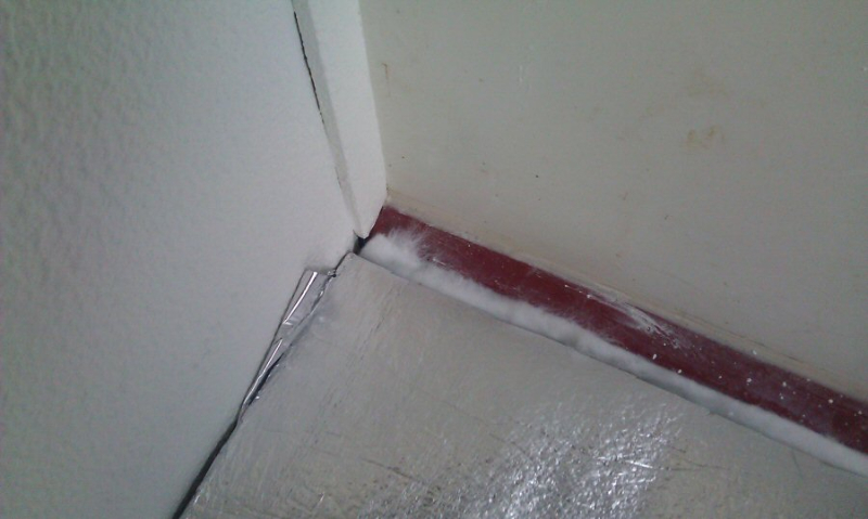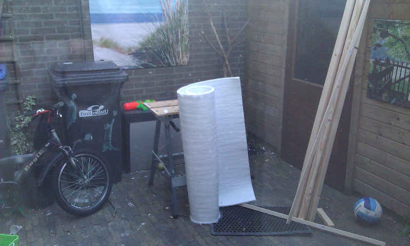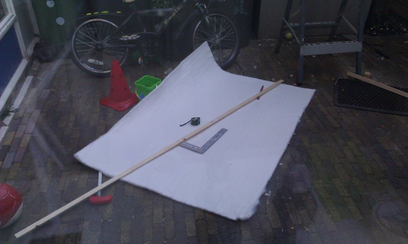 De isolatie is heel apart, het lijkt op harde vloerbedekking waar steeds een lichte stof uit komt. Qua verwerking is het erg eenvoudig, een stanleymes is voldoende om het te snijden. Bij het snijden, toen ik met mijn knieën op het materiaal zat, viel me wat op, het werd heel snel heel warm onder mijn knieën. Het isoleert dus! Een nadeel heeft het ook, je krijgt er echt gortdroge handen van.