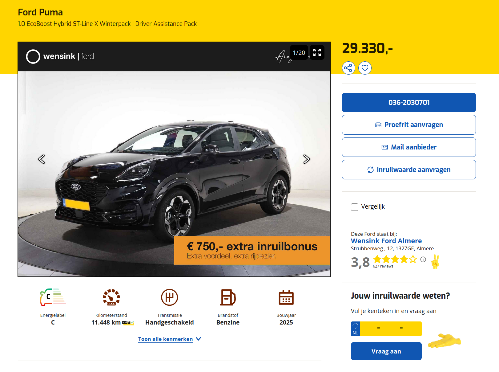 Deze Ford Puma heeft ongeveer 15.000km op de teller, is nog geen jaar oud, redelijk luxe en kost op een haar na geen 30.000 euro.
