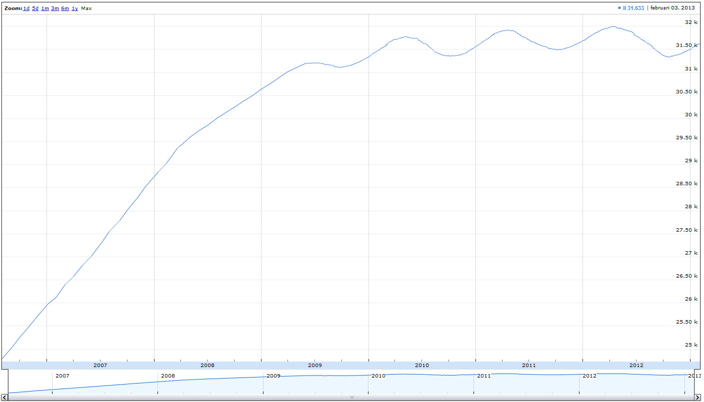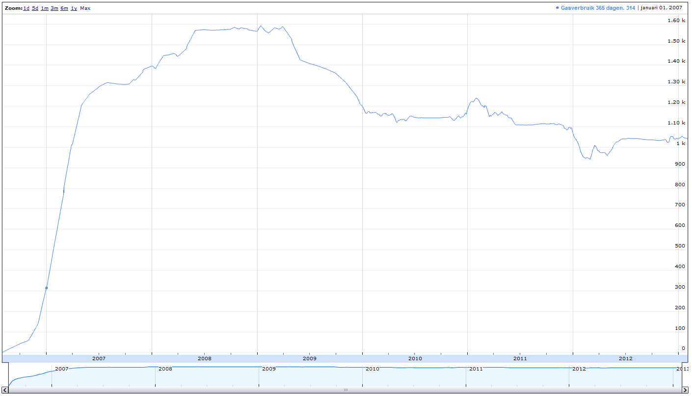 Deze grafiek beschrijft ons stroomverbruik over een periode van een jaar ( opgeteld ). Dus voor 03-01-2013 wordt het verbruik van 03-01-2012 t/m 03-01-2013 bij elkaar opgeteld. Voor 02-01-2013 de periode 02-01-2012 t/m 02-01-2013 en zo verder. De daling is heel mooi te zien tot ongeveer een verbruik van 100kWh over een periode van 365 dagen.