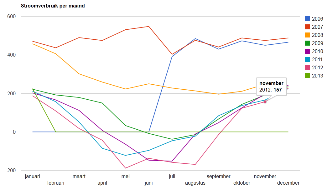 En een wat makkelijkere grafiek, simpelweg ons stroomverbruik voor elke maand sinds 2006.
