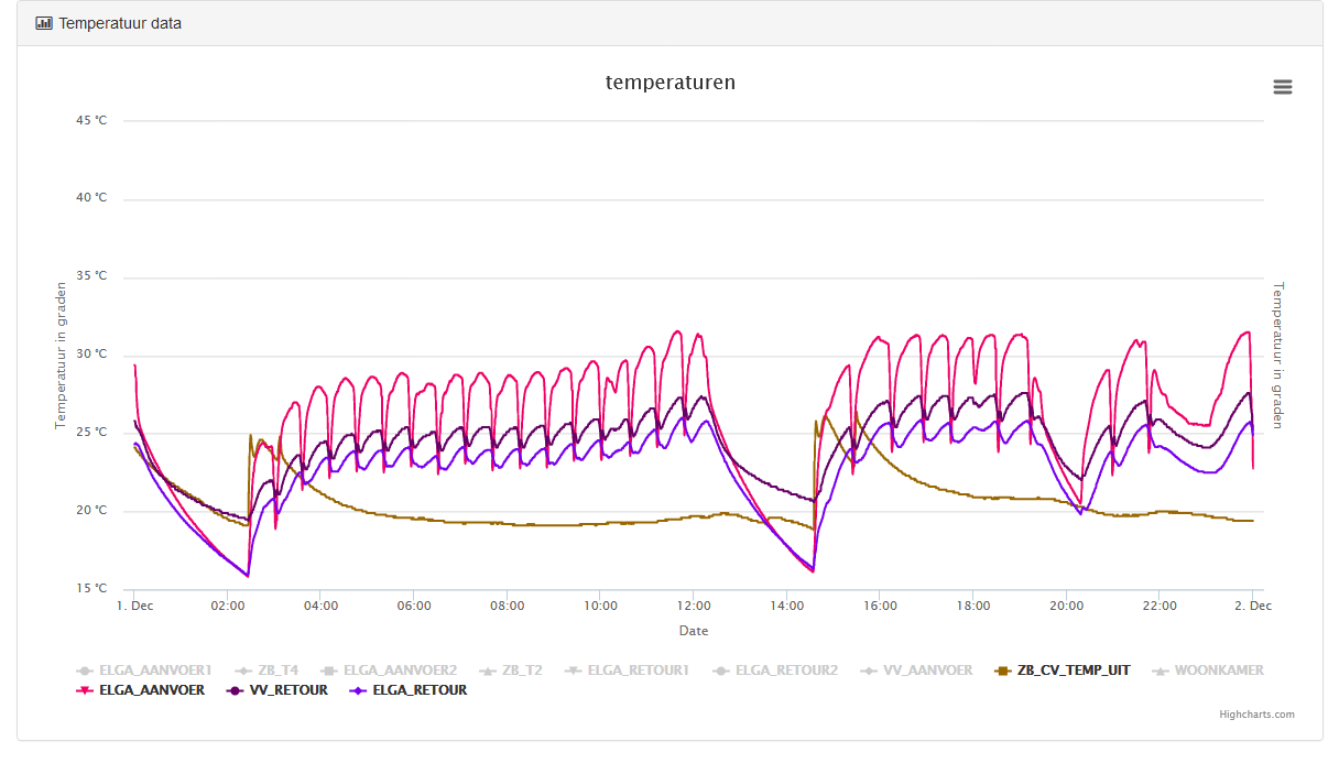 In de nacht houden we het niet op temperatuur terwijl de ELGA vol continu draait. Je kan aan de aanvoertemperatuur mooi zien dat de temperatuur buiten langzaam op loopt. In de middag moet de CV ketel zelfs even aan en daarna kan de ELGA het met een aanvoer van net boven de 30 graden warm houden.
