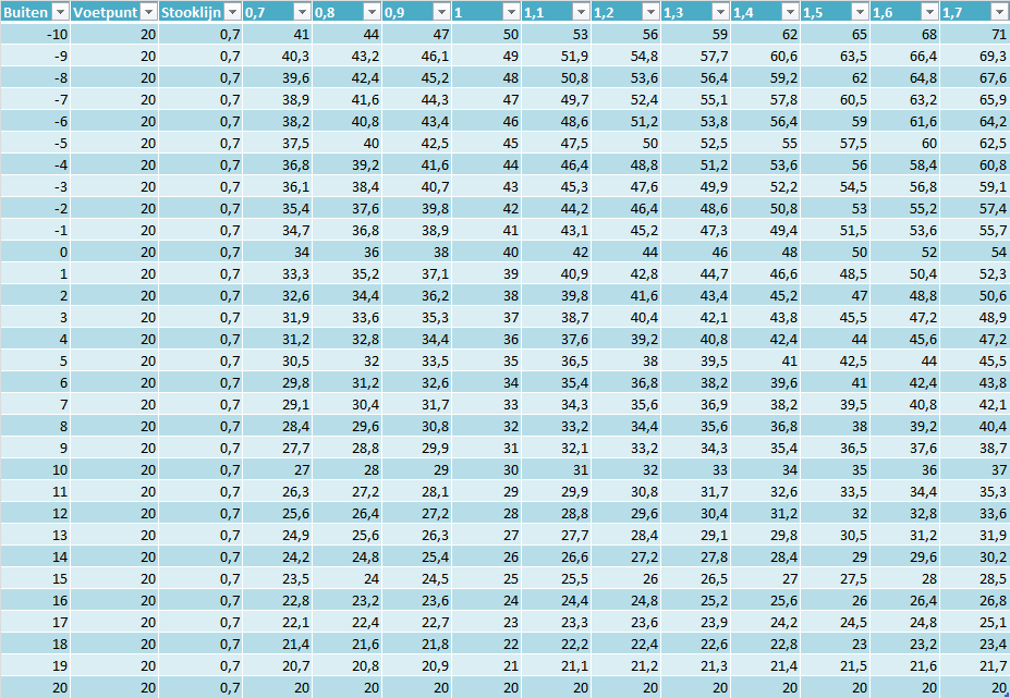 Ik heb een overzicht gemaakt wat de aanvoertemperatuur zou zijn bij een bepaalde buitentemperatuur bij een bepaalde stooklijn.