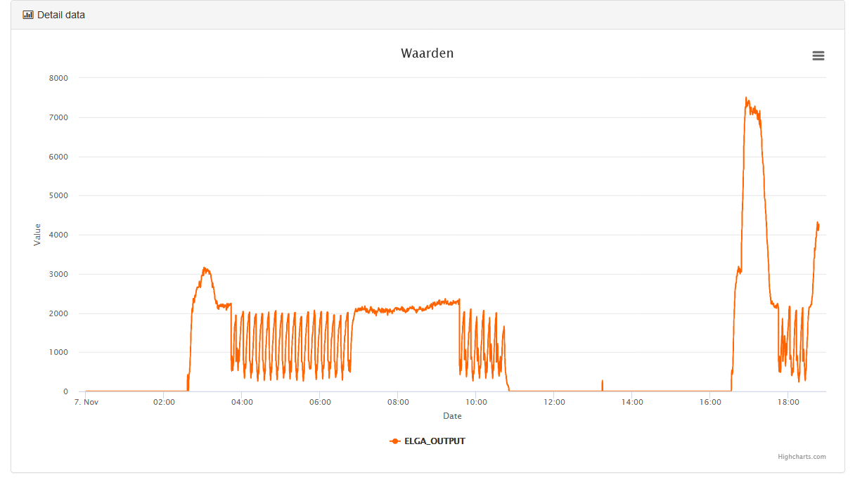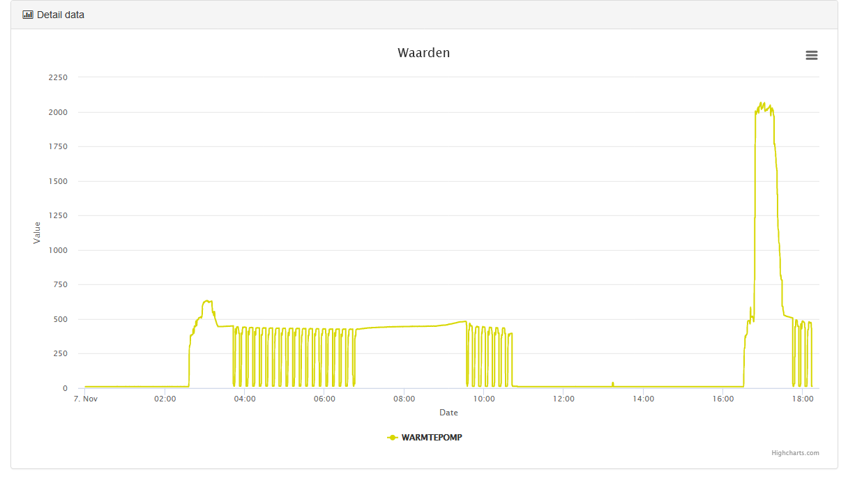 Dit is het geleverde vermogen. Rond 7 uur begint de lange run bij iets boven de 2kW oplopend tot ongeveer 2.3kW