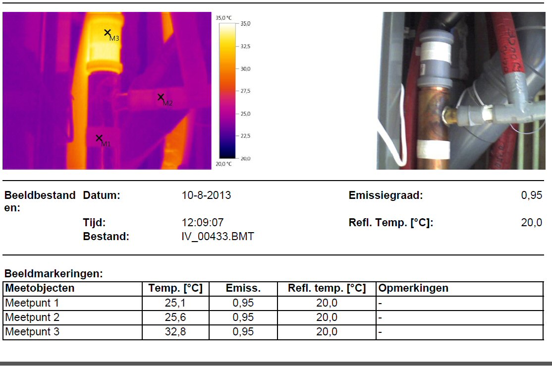 Naar aanleiding dan deze discussie op het forum van www.tweakers.net heb ik de warmtebeeldcamera van boven gehaald en heb besloten wat om wat foto’s te maken van de WTW in volle aktie. Ik heb hiervoor op alle te meten plekken tape geplakt om ze duidelijk van de omgeving te onderscheiden en om de reflectie van alle meetpunten hetzelfde te maken. Ik heb een aantal foto’s gemaakt voordat de WTW draaide, tijdens het omwarmen en de stabiele situatie na ongeveer 10 minuten. En als laatste voorwaarde: De douche stond ingesteld op 38 graden.
