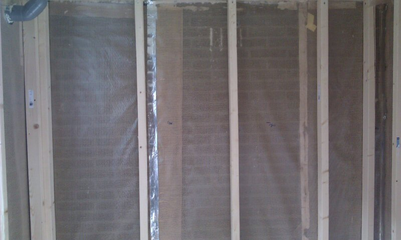 69x44mm balkjes gebruikt strak op de muur met nieuwe folie erachter waar de folie niet meer goed was. Balkjes met een afstand van exact 500mm van elkaar en daarna EPS ertussen. We hebben het EPS wat we weg hebben gesloopt hergebruikt voor zover mogelijk. Dus nu 2x3cm is te zien op de foto’s