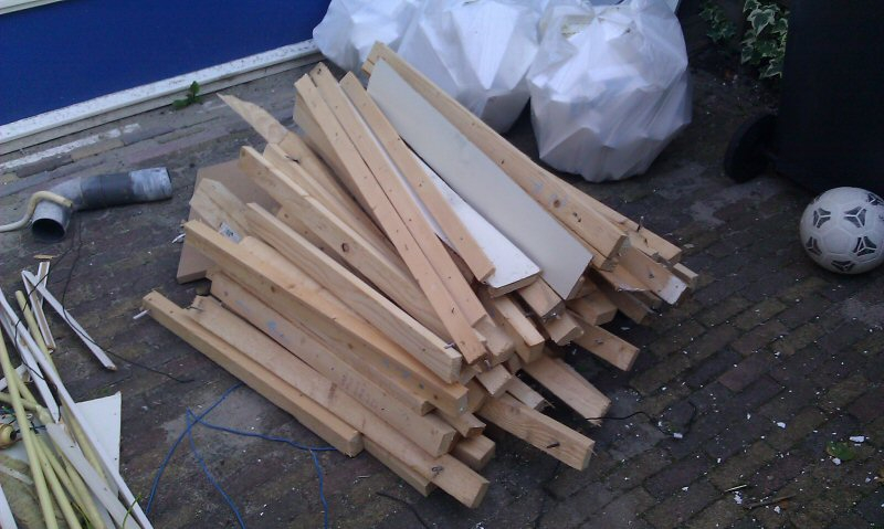 Maar hoe heb je die balken vastgezet? Geschroefd in de muur (incl. gaten boren, pluggen etc.), of met een hoekijzertje oid aan het plafond vastgezet? Want dat lijkt me nog het meeste werk.
