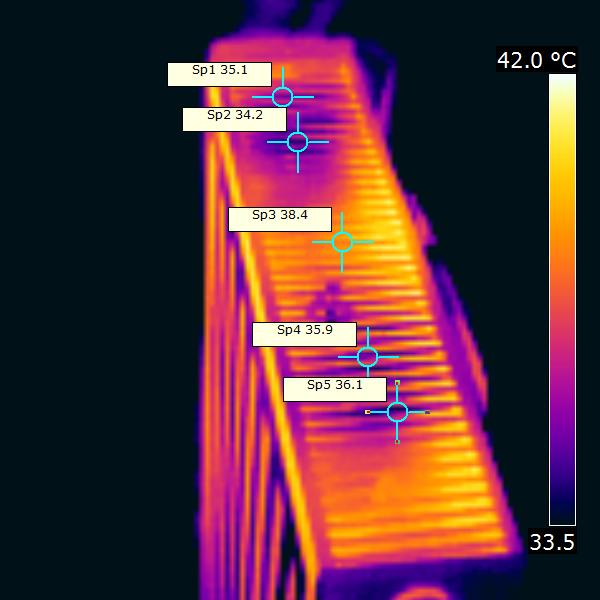 Er zitten twee ventilatoren onder deze radiator, deze plekken zijn duidelijk te zien, hier zijn de lamellen kouder van de radiator!