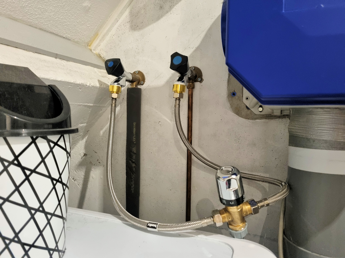 Adapters van 3/4″ naar 1/2″ er op en daarna de slangen erop naar de mengkraan.