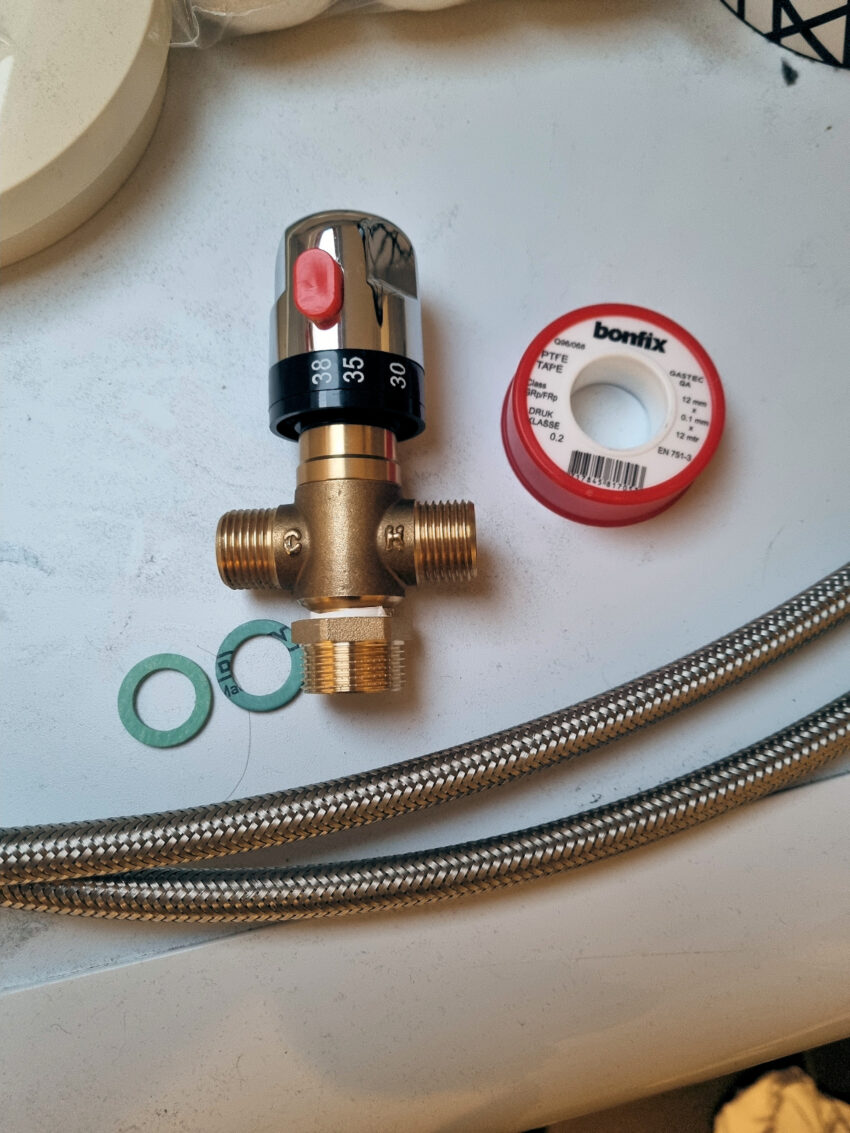 De wasmachine zit intussen weer op warm water aangesloten. De mengkraan was vanmiddag al binnen. Nadeel was alleen dat de mengkraan 1/2″ aansluitingen heeft terwijl wasmachines op 3/4″ worden aangesloten. Dus maar langs Warmteservice om diverse verloopjes en slangen te halen.
