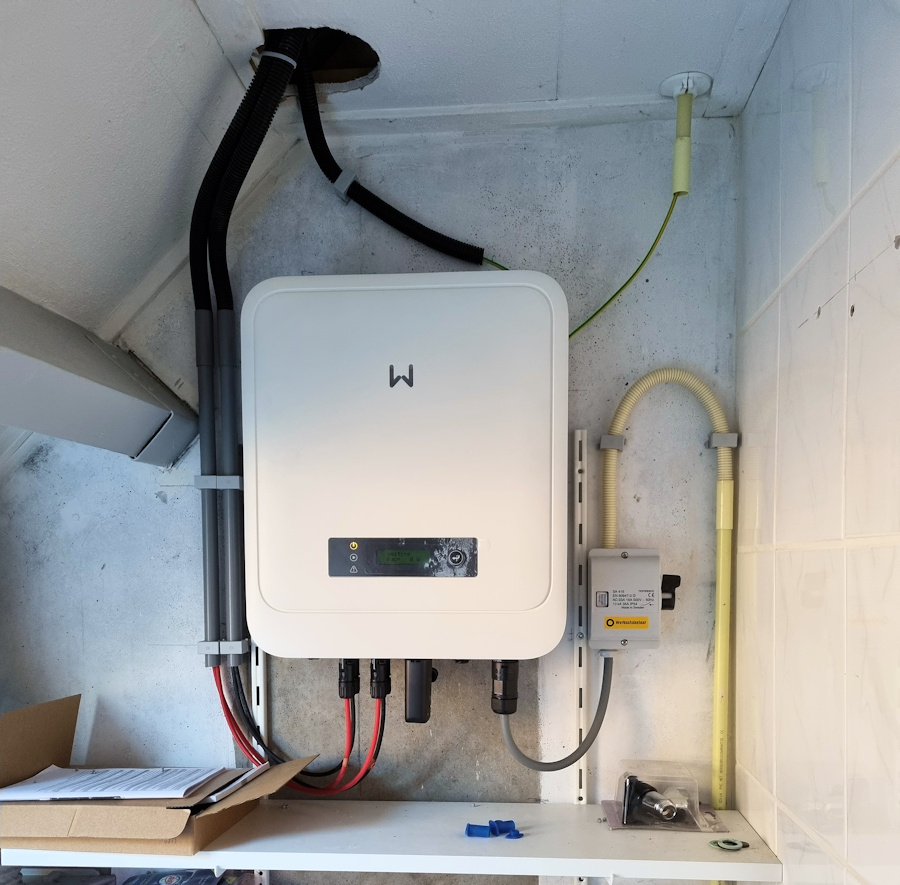 De omvormer is een Goodwe D-NS 3600. Deze omvormer heeft 2 MPP trackers en een bijzonder groot MPP bereik.